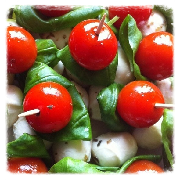 Om en om tomaatjes, mozzarella bolletje en de basilicumblaadjes op een spiesje.