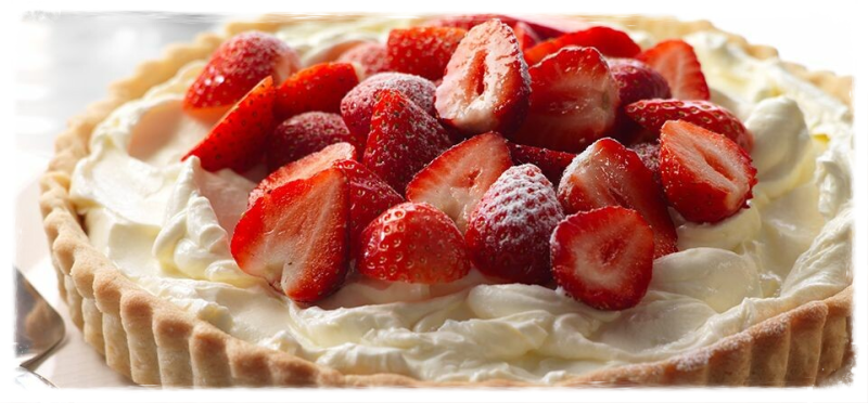 Verwijder de kroontjes en halveer de aardbeien. Garneer de taart ermee.