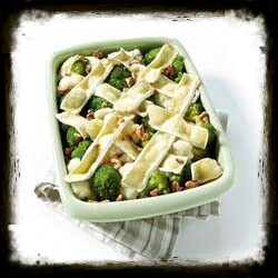 Verdeel de roosjes en de noten over de pasta. Leg de brie erop en zet het gerecht 20 min. ( of tot de brie gesmolten is) in de oven. Serveer de schotel bestrooid met een beetje peper.