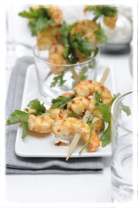Wanneer de garnalen nog niet gepeld zijn, eerst garnalen pellen en schoonmaken. Knoflook teentje ( en de chilipeper) fijn snijden/hakken en klaar zetten voor gebruik. Een wok op het fornuis zetten met wat olie er in als de olie warm genoeg is garnalen erin, knoflook en chili erbij. Wanneer ze afgekoeld zijn dan een aantal aan een spiesje doen. Eventueel wat citroen of limoen sap erover sprenkelen maar is niet nodig, geeft een frisse kick.